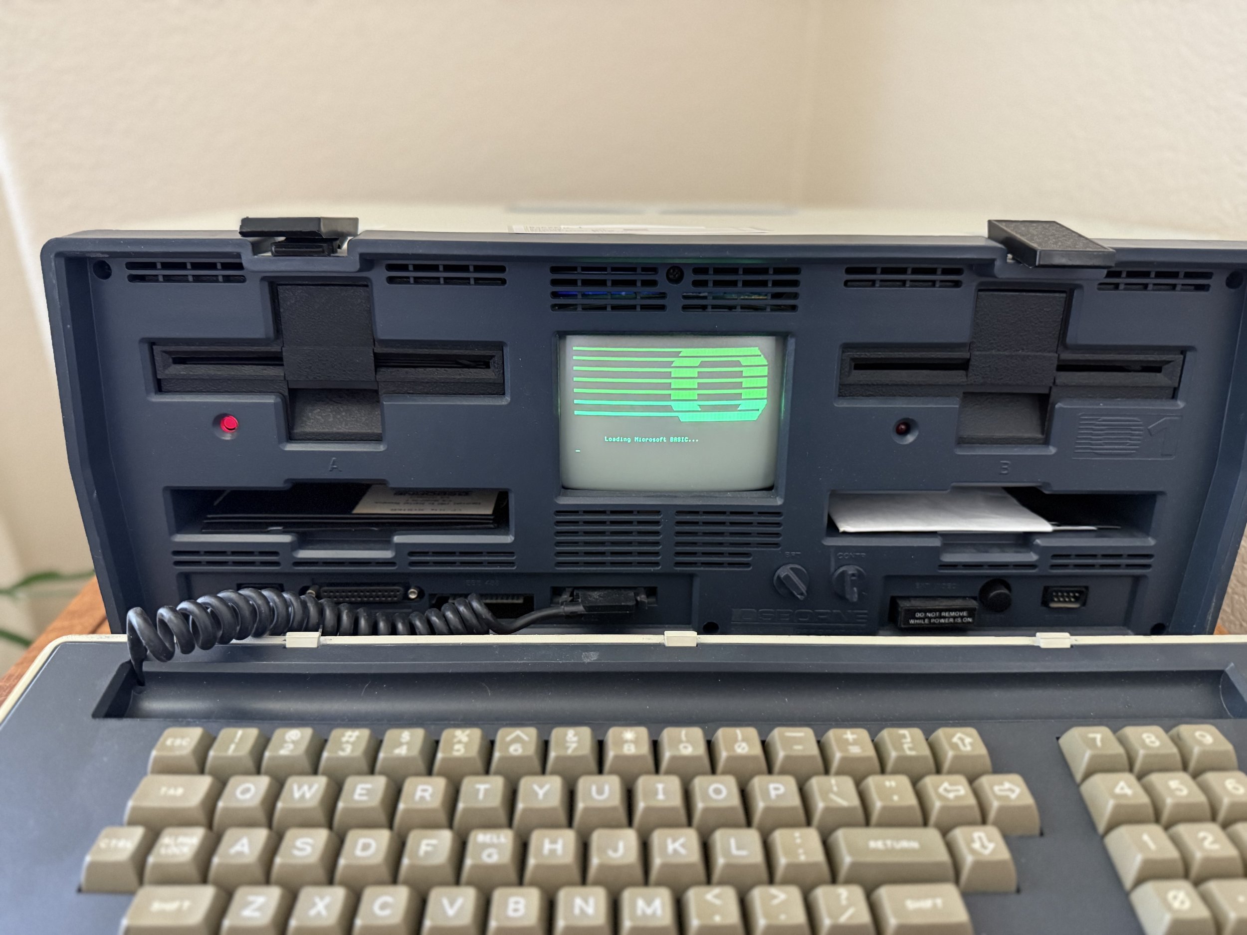 The Osborne-1, which is the only machine I had up and running. Note that the cyan part of the screen is just an artifact of the photo. It’s just a green screen monitor.